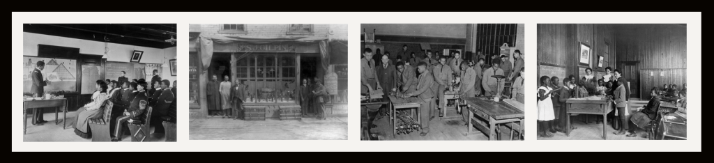 Public domain photo credits, top pf the page: 1) 1899 Hampton Institute, Hampton, Virginia. 2) 1899 S.J. Gilpen shoe store, Richmond, VA. 3) 1933 Civilian Convservation Corps, Third Corps area, Richmond, VA. Cabinet making glass at Armstrong Night School. 4) 1899 Thanksgiving Day lesson at Whittier. (A preparatory school in Phoebus, VA)