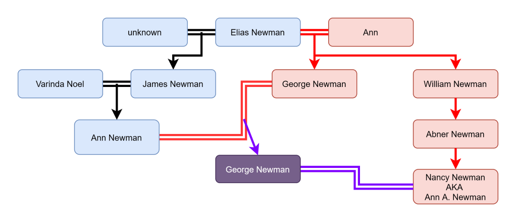 Elias Newman was married twice and had ten children. His first wife is unknown. His second wife was named Ann. There are two things that suggest Elias Newman was married twice. The first is that only Elias’s oldest son, and his three youngest children inherited enslaved laborers. It is possible that Ann brought those enslaved individuals to the marriage, so her children inherited them. The other reason is because Elias’s youngest son George Newman married the daughter of James Newman. It was illegal to marry your niece, but not your half niece, which is called and avunculate marriage. George and Ann Newman did have a legal marriage in Orange County, Virginia. See this chart showing the complexities of George and Ann. The doubles lines represent marriages.