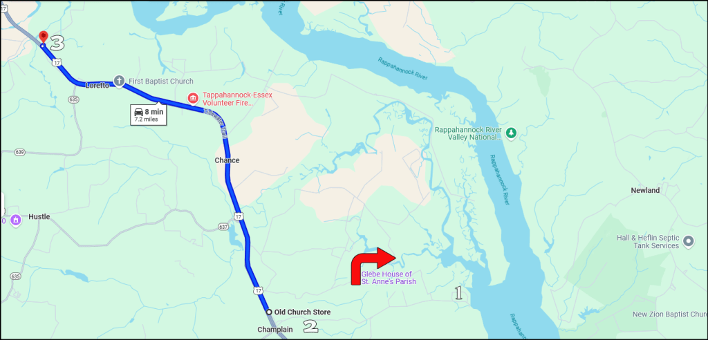 Parish formed 1704. First church built closer to the Glebe house, near the mouth of Occupacia creek at the end of Dangerfield Landing Road, in use 1665-1721. Sale’s church replaced this lower church by the mouth of the Occupaia creek and existed about 1721-1776. Vauter’s Church was built about 1731.