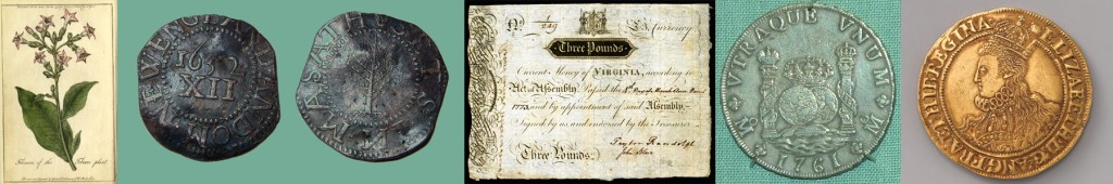 Public domain photo credits for picture at top pf the page. Left to right: 1) Flowers of the Tobacco Plant. 1779 engraving by Copland & Sanson. 2) 1652 pine tree shilling, at National Museum Liverpool. 3) Virginia 3 pound note 1773. 4) 1600’s Spanish pieces of 8, Bank of Mexico. Virginia common coin in 1645. 5) Elizabeth I, 1558-1603, The Royal Mint.